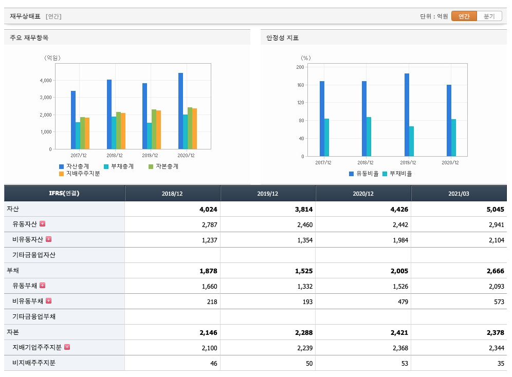 자본은 2018년 2146억원, 2019년 2288억원, 2020년 2421억원으로 증가, 2021년 1분기 2378억원으로 감소 하였습니다.
