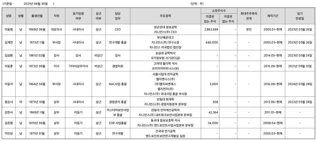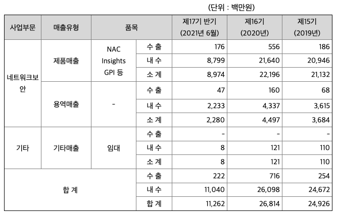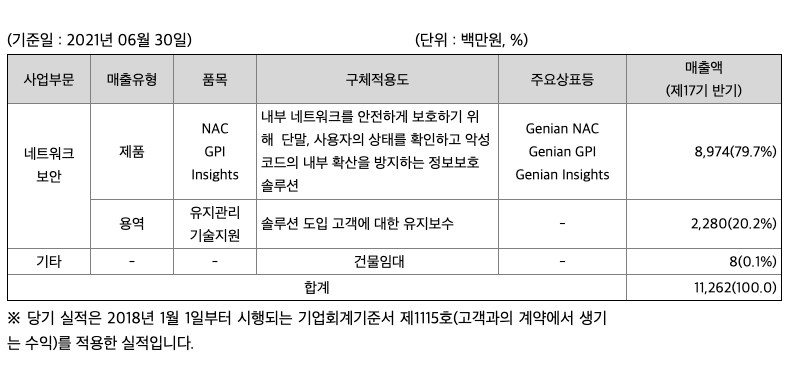 당사는 2005년 설립 이래 16년간 연속 흑자를 기록한 정보보안 소프트웨어 기업입니다. 2016년 미국법인을 설립했으며 2017년 코스닥에 상장했습니다. 가트너 선정 차세대 NAC 대표기업, 프로스트 & 설리번 '글로벌 솔루션 마켓가이드'에 아태지역에서 유일하게 등재되는 등 글로벌 수준의 소프트웨어 기술력을 보유하고 있습니다. 매출형태를 크게 두가지로 구분하면 정보 보안 제품의 판매와 솔루션 도입고객에 대한 유지보수 및 기술지원 용역으로 구분됩니다. 당사의 제품으로는 기업 내부의 네트워크를 보호해 주는 NAC(Network Access Control, 네트워크 접근 제어 솔루션), 랜섬웨어로 대표되는 고도화되고 지능화된 사이버 위협에 대응하는 EDR(Endpoint Detection & Response, 단말기반 지능형 위협 탐지 및 대응 솔루션)과 PC 보안 진단 솔루션인 GPI(Genian Policy Inspector)가 있으며, NAC 솔루션은 2020년 조달기준 시장점유율 72%로 독보적인 1위를 기록하고 있으며 차세대 성장동력인 EDR 솔루션 사업부문은 국내 최초개발, 국내 최초 조달 등록, 국내 최다 고객을 확보하여 시장을 빠르게 선점하고 있습니다. 2021년 반기 기준으로 연결기준 총매출액은 11,262백만원이며, 제품판매에 관한 매출액은 8,974백만원(79.7%), 용역매출은 2,280백만원(20.2%), 기타매출 8백만원(0.1%)입니다. 공시대상 사업부문은 정보보안 솔루션 공급의 단일 사업부문이며, 주요 원재료인 솔루션 관련 server의 설계 및 개발은 당사에서, 제작은 외주처에서 생산하여 구매하고 있습니다. 따라서 생산설비를 보유하고 있지 않으며 인적자원 및 단순외주 작업을 활용한 보안 소프트웨어 및 하드웨어 개발 공급업이 주 업종입니다. NAC의 안정적인 매출에 기반하여 당사는 차세대 성장 동력 확보에 아낌 없는 투자를 진행하고 있습니다. 제 2도약을 위한 변곡점 돌파를 위해 신규 시장 개척 및 글로벌 기업들과의 적극적인 제휴, 신규 기술 확보를 위한 M&A를 추진해 왔습니다. 당사의 최종 목표는 차세대 정보보안 시장의 리더십을 확고히 하는 것입니다. NAC의 시장 지배력에 근간하여 차세대 성장동력으로 EDR을 굳건히 하고 클라우드· OT 분야 진입을 통해 IoT·5G AI 시대의 통합 보안 플랫폼 기업으로 거듭난다는 계획입니다.