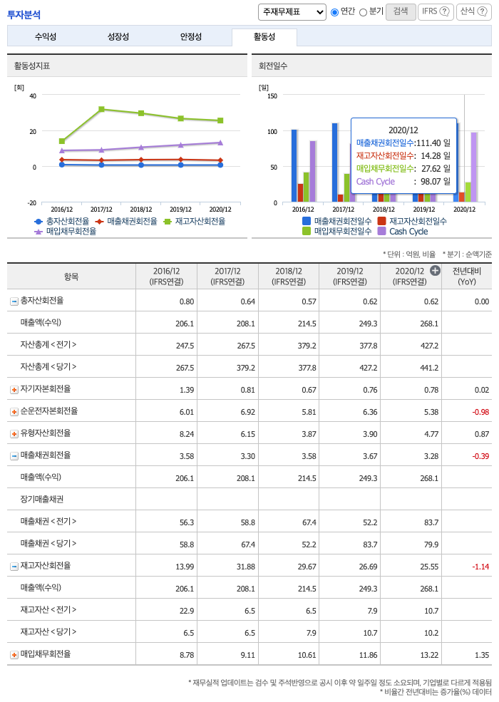 **매출채권회전일수(=돈을 받는 순환일 수, 낮을 수록 좋습니다) 약 111일, 재고자산회전일수(=재고자산 빠지는 일수, 높을 수록 좋습니다) 약 14일, 매입채무회전일수(=돈을 늦게 줘도 되는 일 수, 높을 수록 좋습니다) 약 27일이고, Cash Cycle(현금회전율, 낮을 수록 좋습니다) 약 98일로 현금운영이 불안정적입니다.