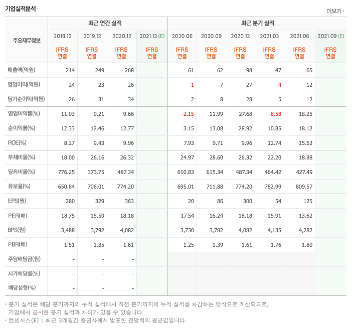 매출액 : 2018년 214억원, 2019년 249억원, 2020년 268억원, 2021년 1,2분기 113억원으로 전년동기대비 증가하였습니다. 2021년 2분기는 전년동기대비 4.4% 증가하였습니다.2020년 분기별로 보면 3분기 62억원, 4분기 98억원, 2021년 1분기 47억원, 2분기 65억원입니다.