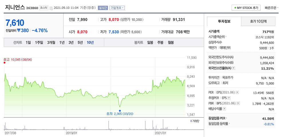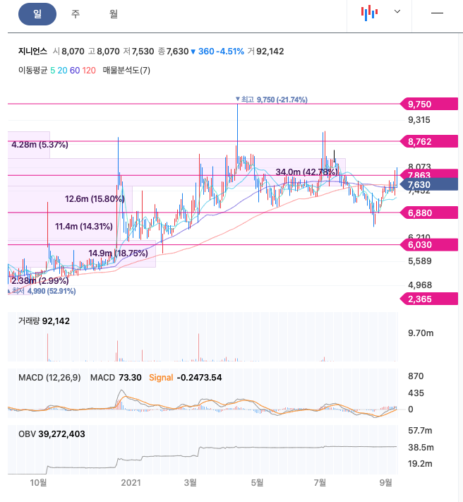 지니언스의 주가는 20년 10월부터 지송적으로 우상향하고 있으며, 21년 4월 최고 9750원을찍고 보합중에 있습니다.