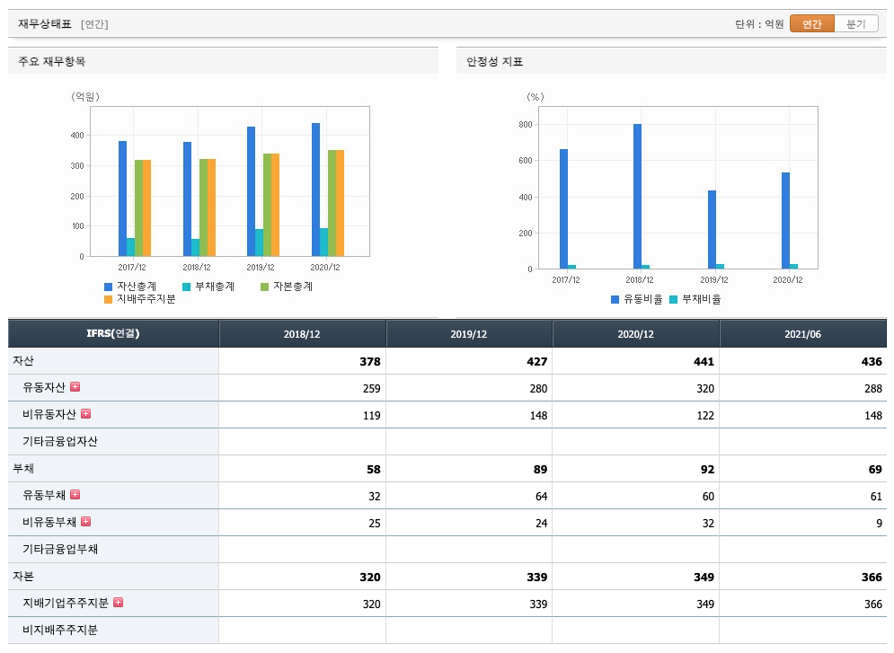 자산은 2018년 378억원, 2019년 427억원, 2020년 441억원으로 증가, 2021년 1분기 436억원으로 감소하였습니다.