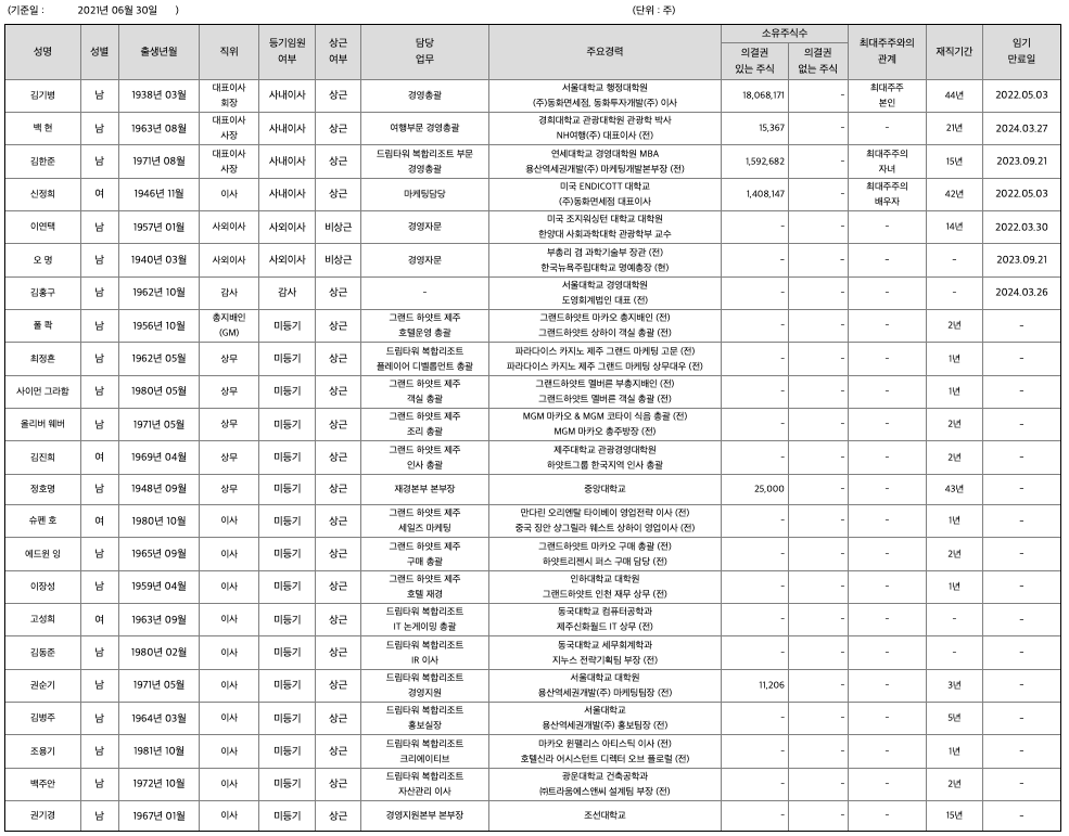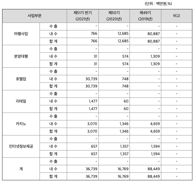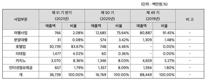 당사는 1971년도에 설립된 여행전문업체로 관광개발 및 국내외 여행알선업, 항공권 판매대행업, 전세 운수업을 주요 사업으로 영위해온 대한민국 대표 종합여행기업입니다. 2020년 12월 18일 제주 드림타워 복합리조트가 오픈하면서 당사의 사업 포트폴리오는 호텔과 리테일까지 확장되었습니다. 제주 드림타워 복합리조트는 38층, 169m 높이로 제주에서 가장 높은 롯데시티호텔(89m)보다 2배 가량 높으며, 연면적은 여의도 63빌딩의 1.8배인 30만3,737㎡로 제주도 최대 규모 입니다. 글로벌 호텔 브랜드인 하얏트그룹이 전체 1,600객실 및 14개 레스토랑과 바, 8층 풀데크, 38층 전망대, 호텔부대시설 등을 '그랜드 하얏트 제주'로 운영합니다. 또한 2020년 12월 18일부터 패션 전문쇼핑몰 'HAN Collection(한컬렉션)'을 오픈하며 패션·유통사업에 신규 진출하였습니다. 제주 드림타워 복합리조트(제주점) 및 서울 광화문빌딩(서울점)에 총 2곳의 매장을 오픈하였으며, 우리나라를 대표하는 200여명의 디자이너가 참여한 14개의 아이템별 편집숍을 운영하고 있습니다. (상세한 내용은 7. 기타 참고사항의 '제주 드림타워 복합리조트 소개'을 참조해주십시오.) 한편, 당사의 종속회사인 (주)엘티엔터테인먼트는 엘티카지노(외국인전용카지노)의 영업장 소재지를 기존 롯데호텔제주에서 제주 드림타워 복합리조트로 이전하고, 영업장 면적을 기존의 1,176㎡에서 5,367㎡로 확장하기 위하여 2021년 1월 29일 '엘티카지노의 영업장 소재지 및 면적 변경 허가'를 제주특별자치도에 신청하였으며, 2021년 4월 8일 변경 허가를 득하였습니다. 이에 따라 엘티카지노를 제주 드림타워 복합리조트로 확장 이전하여 2021년 6월 11일 개장하였습니다. 참고로 당사는 2014년 정관 개정을 통해 카지노업을 사업목적으로 추가하였으며, 2018년 8월 17일 파라다이스그룹이 제주 롯데호텔에서 운영중이던 '파라다이스 제주롯데 카지노(주식회사 두성)'를 주식양수도계약을 통해 149억원에 인수한 후, 상호를 '엘티카지노(주식회사 엘티엔터테인먼트)' 로 변경하고 350억원 유상증자에 참여하여 엘티카지노의 재무구조를 개선함으로써 카지노사업 진출의 기반을 마련하였습니다. (종속회사 (주)엘티엔터테인먼트에 대한 내용은 XII. 상세표를 참고해주십시오.) 또한 당사는 국내여행을 시작으로 74년 해외여행 시장에 진출하여, 현재는 2개 사업부(여행사업부, 재경부), 23개 팀으로 구성되어 있으며, 전국 대리점 및 여행사들과의 업무 협력을 통한 판매망 확보, 활발한 영업활동을 통해 매출 및 시장 점유 확대를 지속적으로 전개하고 있습니다. 일반 패키지 상품을 비롯하여 법인(상용)영업, 크루즈, 자유 및 맞춤여행 등의 전문상품과 저렴한 항공권, 유학 및 어학연수, 호텔, 렌터카, 철도 등 다양한 형태의 상품을 오프라인 영업망과 온라인 유통채널 확대를 통해 판매하고 있습니다. 국내 여행부문은 일반패키지상품 뿐만 아니라 지자체와 협업하여 특화된 상품 출시로 재래시장 및 지역경제 활성화에 동참하고 있으며, 철도권 판매, 직영 전세버스 등 영업을 전개하고 있어, 내용이나 규모면에서 차별화된 서비스를 제공하고 있습니다.
