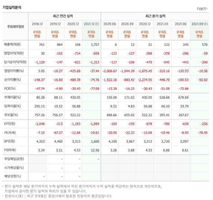 영업이익 : 2018년 30억원, 2019년 -162억원, 2020년 -714억원, 2021년 1,2분기 -674억원으로 전년동기대비 적자지속하였습니다. 2020년 분기별로 보면 3분기 -127억원, 4분기 -388억원, 2021년 1분기 -378억원, 2분기 -296억원입니다.