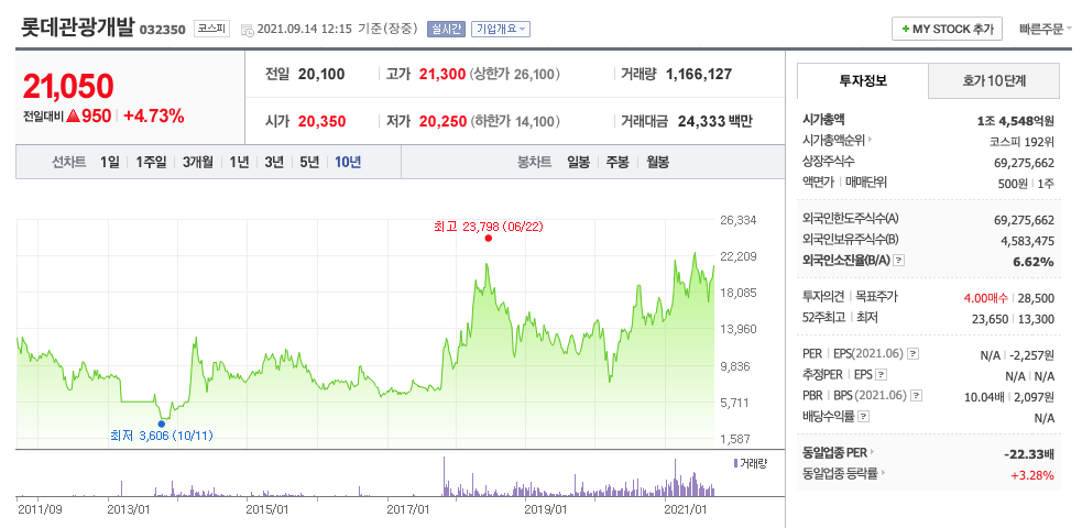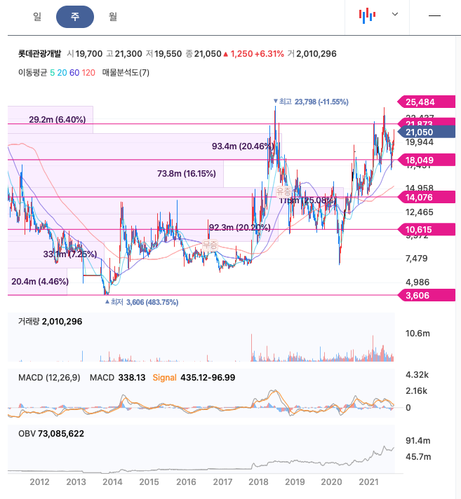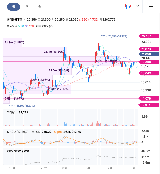 롯데관광개발은 21년 2월주가가 반등하였고, 이후 급등락을 오갔고, 21년 6월 최고 23,650원을 찍고 조정을 받은 뒤 반등을 하고 있습니다.