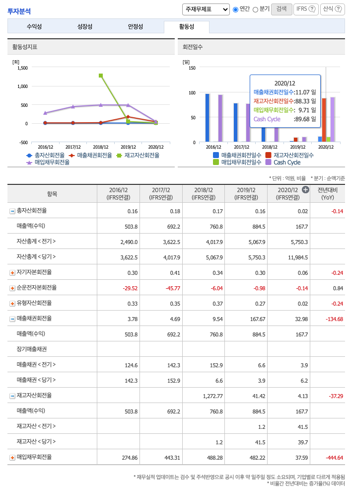 재고자산회전율(높을 수록 좋습니다) : 2018년 약 1억원, 2019년 약 41억원, 2020년 약 39억원이고, 회전율은 2018년 약 1272%, 2019년 약 41%, 2020년 약 4%로 불안정적입니다.