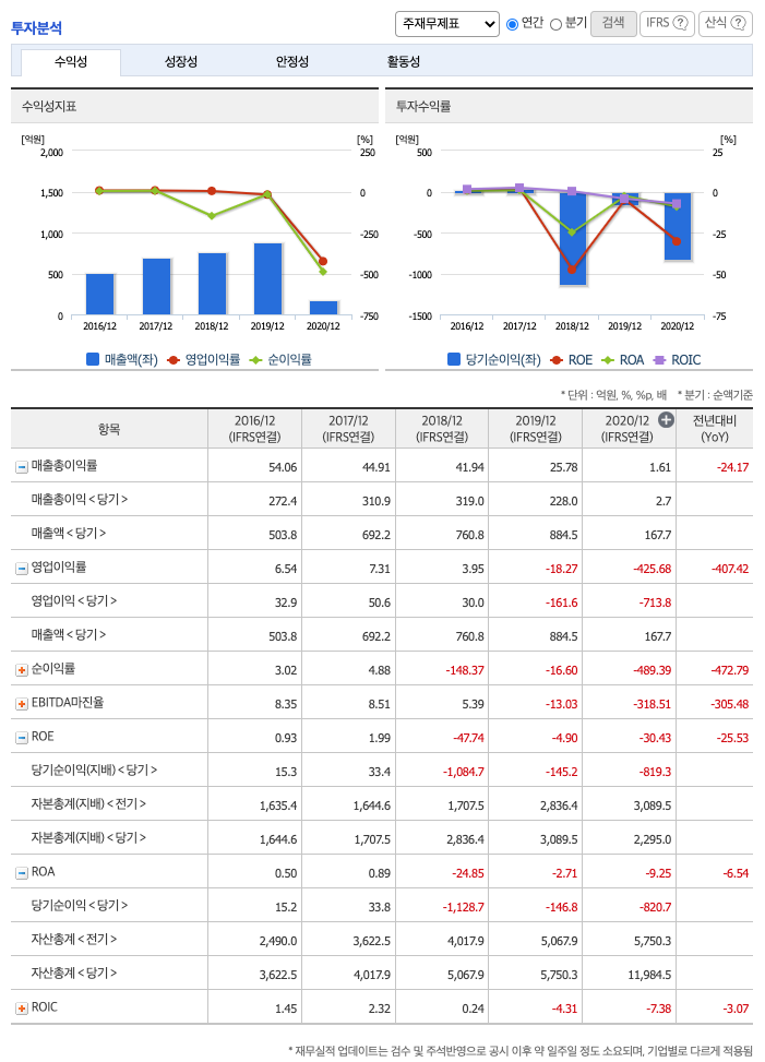 ROE(Return On Equity, 자기자본순이익율, 주주의 관점) : 2016년 약 0.93%, 2017년 약 1.99%, 2018년 약 -47.74%, 2019년 약 -4.9%, 2020년 약 -30.43%이고, 자기자본순이익율은 이상율(10%)보다 낮습니다.