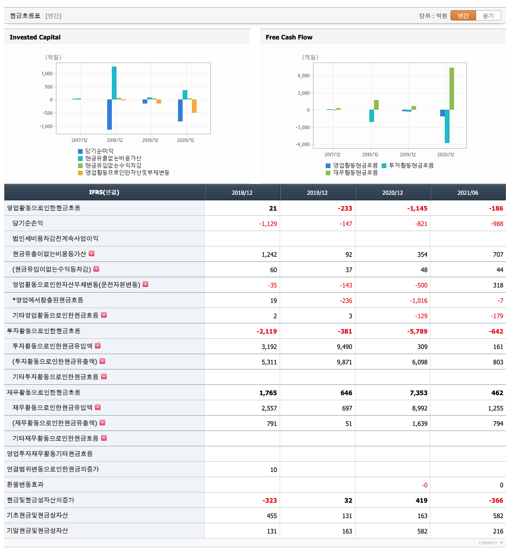 영업활동 현금흐름 : 2018년 21억원, 2019년 -233억원, 2020년 -1145억원, 2021년 1,2분기 -186억원으로 2019년부터 영업활동 현금흐름이 원활하지 못합니다.