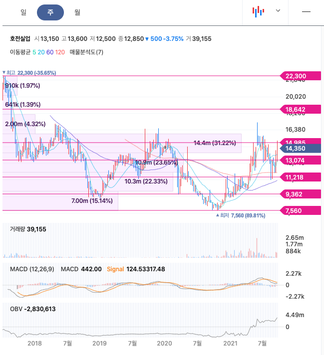 호전실업은 21년 4월에 주가가 급등하여 21년 5월에 최고 17,200원을 찍고 조정을 받았습니다.