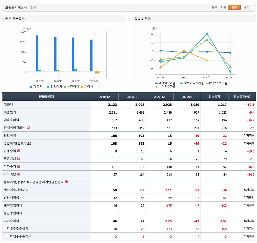 매출액 : 2018년 3133억원, 2019년 3098억원, 2020년 2925억원, 2021년 1,2분기 1089억원으로 전년동기대비 감소하였습니다. 2021년 2분기는 전년동기대비 -10.5% 감소하였습니다. 2020년 분기별로 보면 3분기 939억원, 4분기 769억원, 2021년 1분기 556억원, 2분기 553억원입니다.