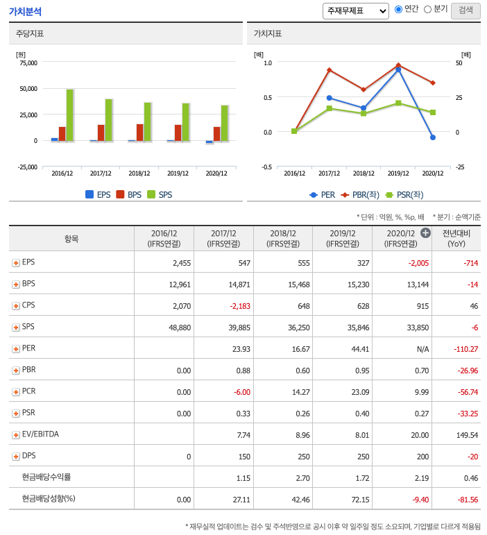 ROE(Return On Equity, 자기자본순이익율, 주주의 관점) : 2016년 약 21%, 2017년 약 4%, 2018년 약 3%, 2019년 약 2%, 2020년 약 -14%이고, 자기자본순이익율은 이상율(10%)보다 낮습니다.