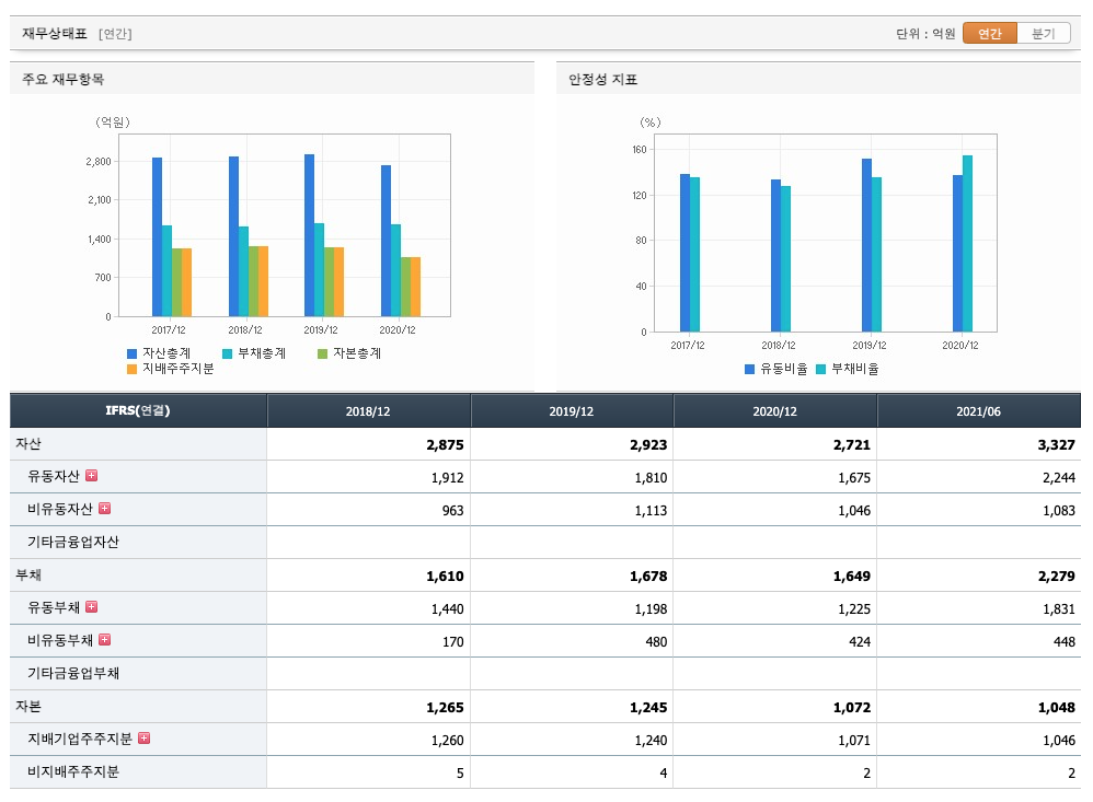 자산은 2018년 2875억원, 2019년 2923억원, 2020년 2721억원으로 감소, 2021년 1,2분기 3327억원으로 증가하였습니다.