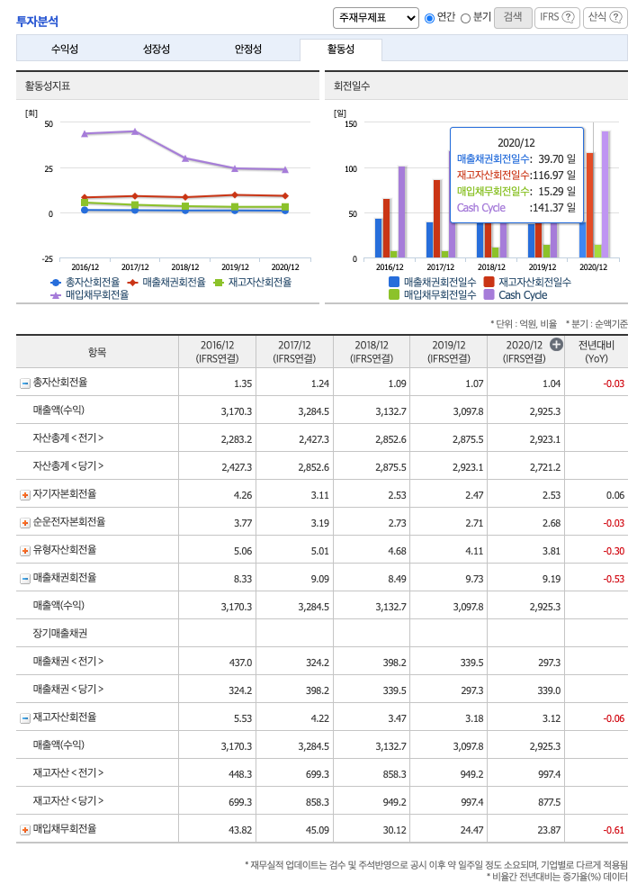 재고자산회전율(높을 수록 좋습니다) : 2018년 약 949억원, 2019년 약 997억원, 2020년 약 877억원이고, 회전율은 2018년 약 3%, 2019년 약 3%, 2020년 약 3%로 안정적입니다.