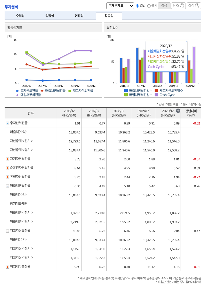 재고자산회전율(높을 수록 좋습니다) : 2018년 약 1653억원, 2019년 약 1524억원, 2020년 약 1524억원이고, 회전율은 2018년 약 6%, 2019년 약 6%, 2020년 약 7%로 안정적입니다.