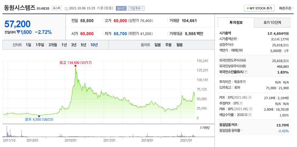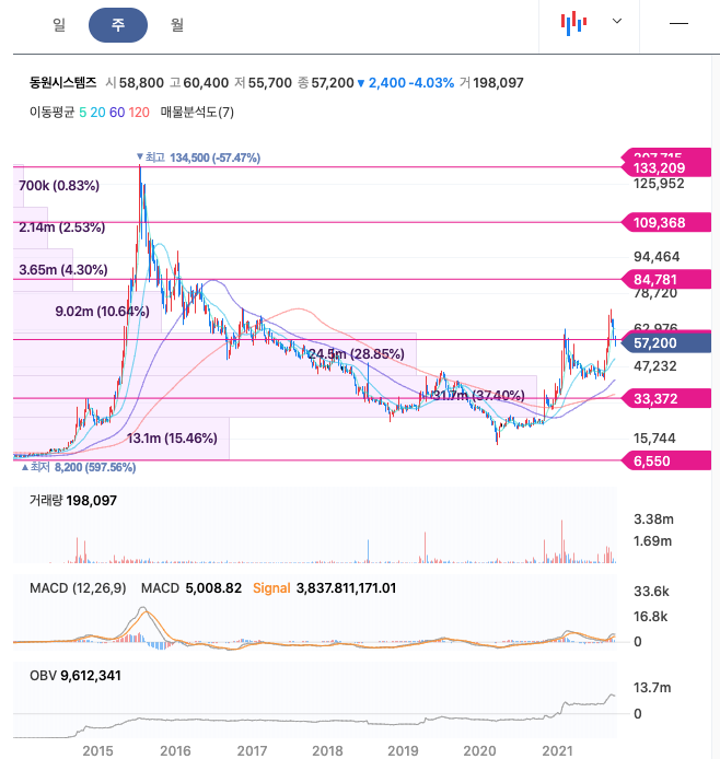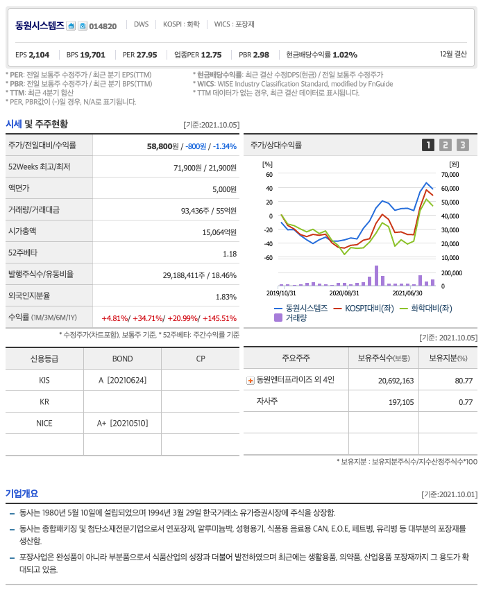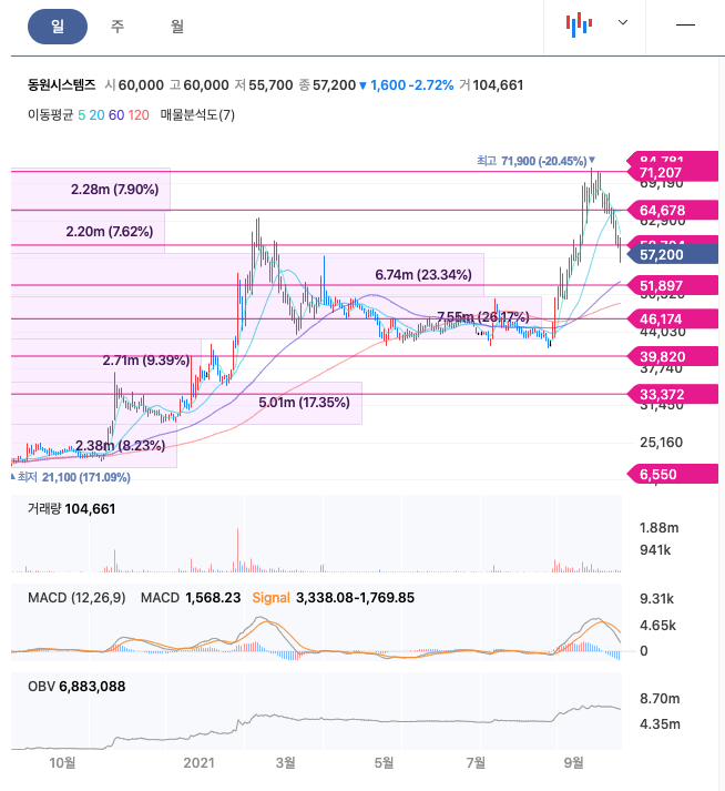동원시스템즈는 20년 11월에 주가가 반등하여 21년 2월까지 상승하였고, 이후 조정을 받다가 21년 9월 최고 71,900원을 찍고 조정을 받고 있습니다.
