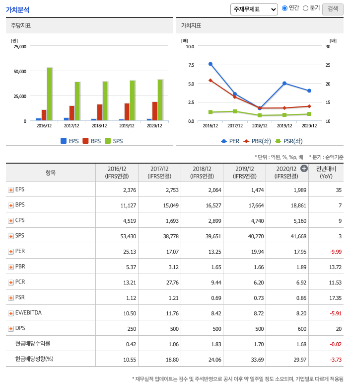 DPS(Dividend Per Share의 약자, 총배당금을 총주식발생수로 나눈 것, 한 주당 얼만큼의 배당금을 받을 수 있는지 알 수 있는 지표, DPS가 높을 수록 배당금이 많은 것임) : 2016년 250원, 2017년 500원, 2018년 500원, 2019년 500원, 2020년 600원으로 증가하였습니다.