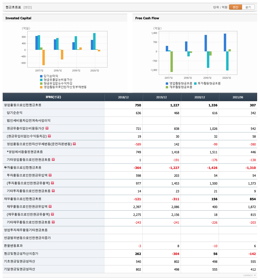 투자활동 현금흐름 : 2018년 -364억원, 2019년 -1227억원, 2020년 -1426억원, 2021년 1,2분기 -1310억원으로 투자활동 현금흐름이 원활합니다.