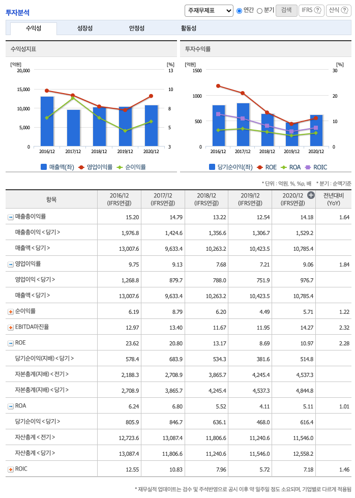 ROE(Return On Equity, 자기자본순이익율, 주주의 관점) : 2016년 약 23%, 2017년 약 20%, 2018년 약 13%, 2019년 약 8%, 2020년 약 10%이고, 자기자본순이익율은 이상율(10%)보다 높습니다.