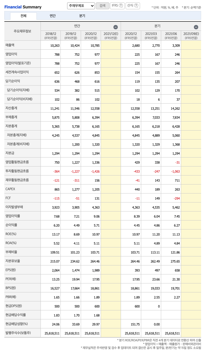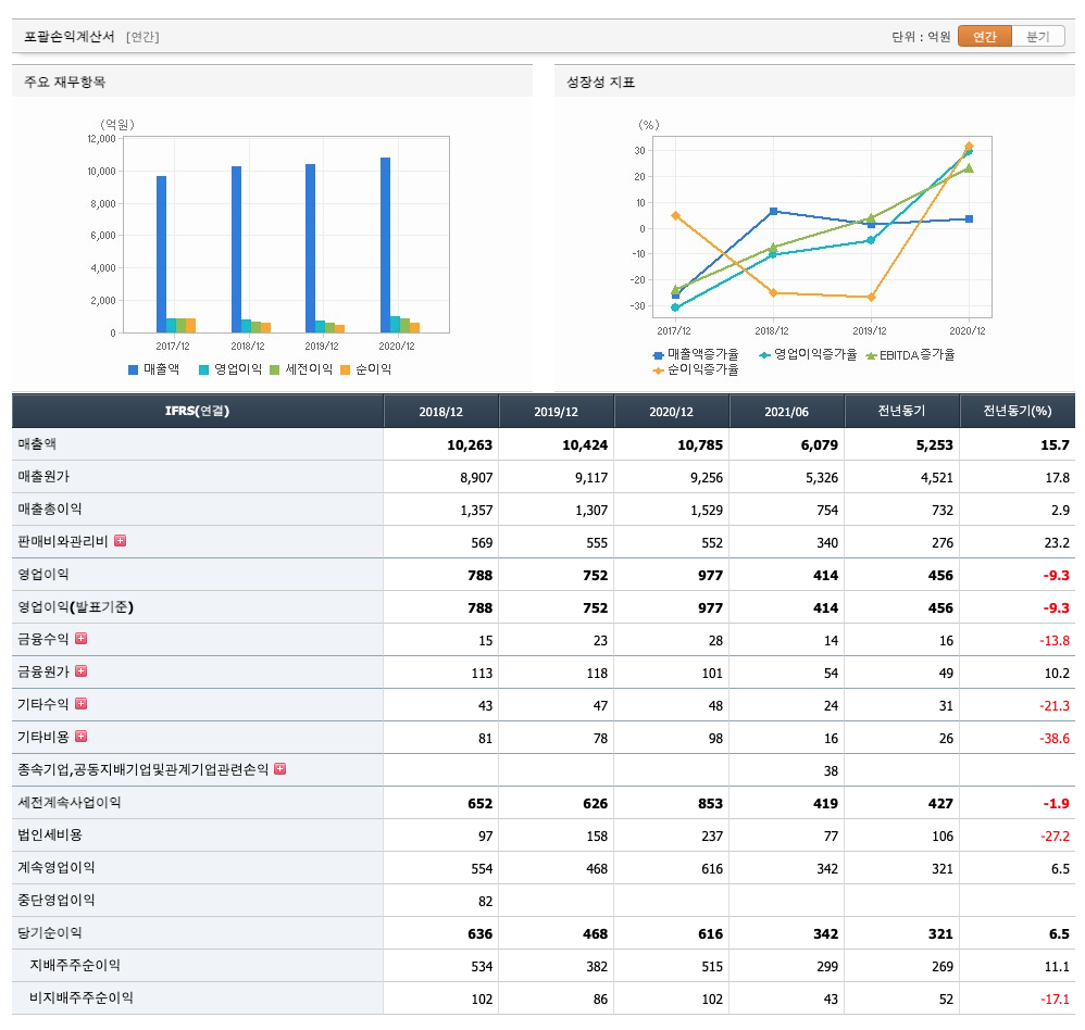 매출액 : 2018년 10,263억원, 2019년 10,424억원, 2020년 10,785억원으로 증가, 2021년 1,2분기 6,079억원으로 전년동기대비 증가하였습니다. 2021년 2분기는 전년동기대비 15.7% 증가하였습니다. 2020년 분기별로 보면 3분기 2852억원, 4분기 2680억원, 2021년 1분기 2770억원, 2분기 3309억원입니다.