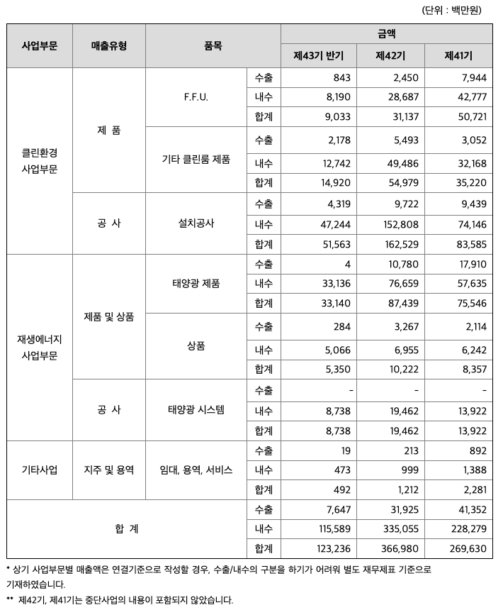 당반기 공시 대상 기간 중 당사의 매출실적 중, 주요 사업부문인 클린환경 사업부문의 매출은 75,516백만원, 재생에너지 사업부문의 매출은 47,227백만원이었으며, 기타사업부문 매출은 492백만원이었습니다. 당 공시 대상 기간 중 주요 매출처는 삼성전자(주) 및 삼성물산(주)입니다.