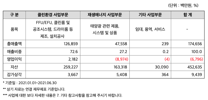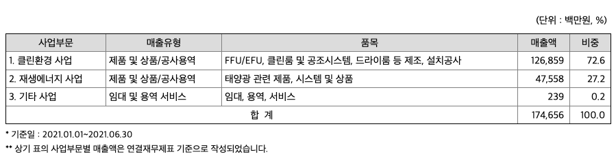 당사는 본 보고서 작성기준일 현재 클린환경 사업부문, 재생에너지 사업부문을 주요 사업으로 영위하고 있으며, 각 사업부문에 대한 요약 재무현황은 다음과 같습니다.