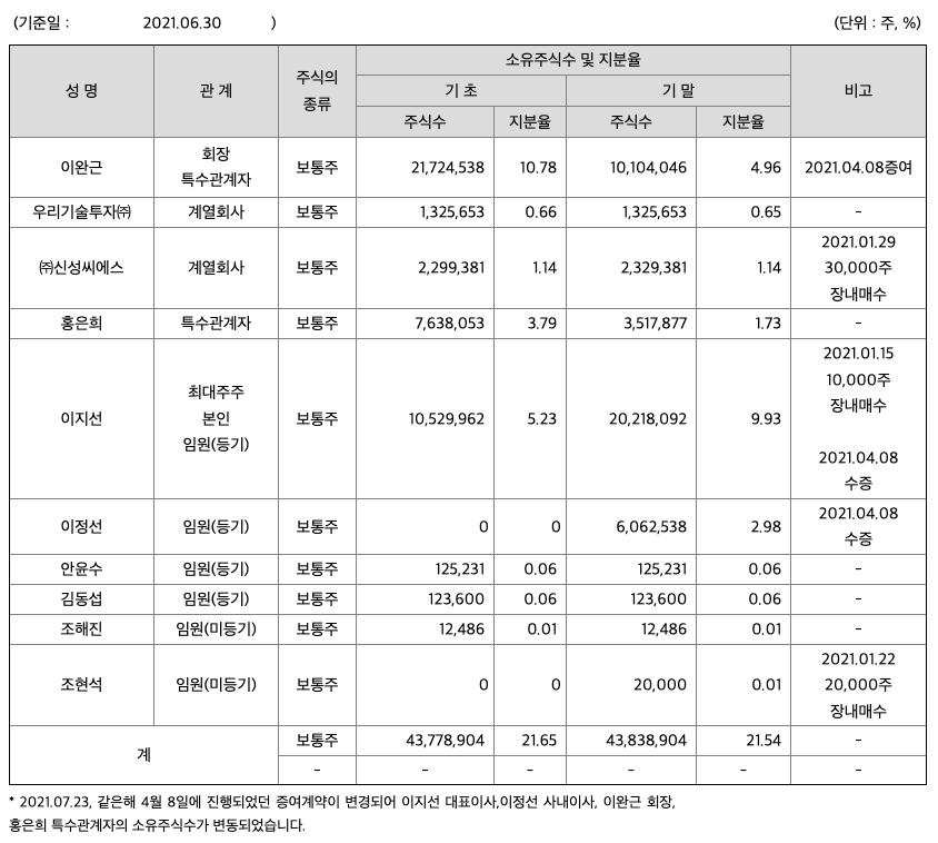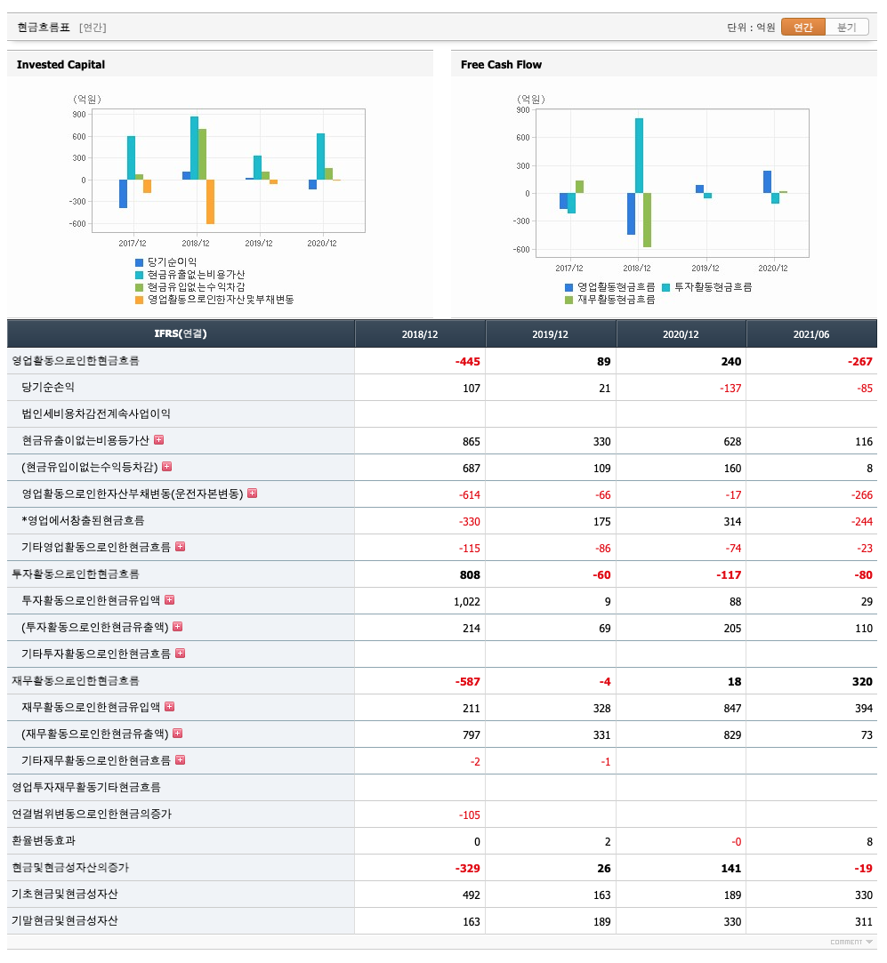 영업활동 현금흐름 : 2018년 -445억원, 2019년 89억원, 2020년 240억원, 2021년 1,2분기 -267억원으로 2019년과 2020년의 영업활동 현금흐름이 원활합니다.
