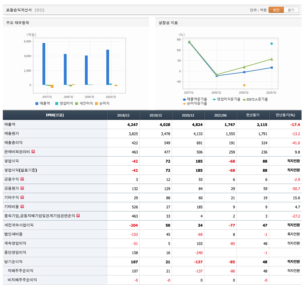 매출액 : 2018년 4247억원, 2019년 4028억원으로 감소, 2020년 4824억원으로 증가, 2021년 1,2분기 1747억원으로 전년동기대비 감소하였습니다. 2021년 2분기는 전년동기대비 -17.4% 감소하였습니다. 2020년 분기별로 보면 3분기 1386억원, 4분기 1323억원, 2021년 1분기 756억원, 2분기 991억원입니다.