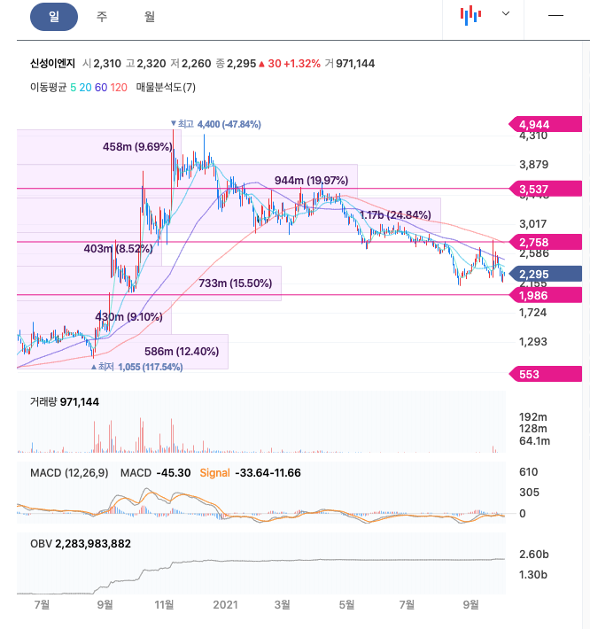 신성이엔지는 20년 8월부터 주가가 반등하여 20년 11월 최고 4,400원을 찍고 조정을 받고 있습니다.