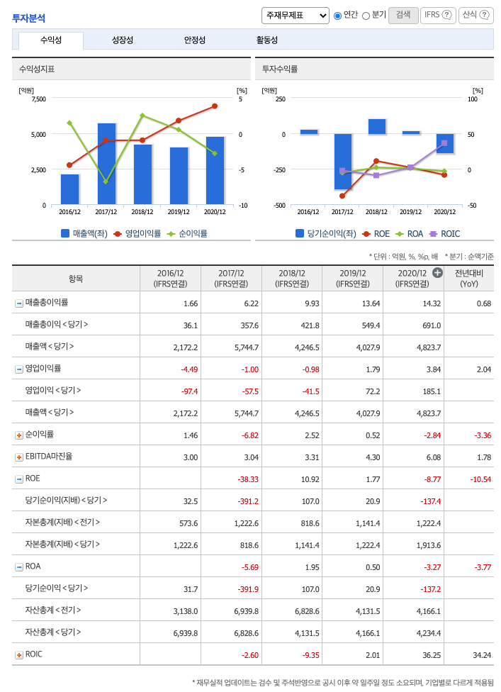 ROE(Return On Equity, 자기자본순이익율, 주주의 관점) : 2017년 약 -38%, 2018년 약 10%, 2019년 약 1%, 2020년 약 -8%이고, 자기자본순이익율은 이상율(10%)보다 낮습니다.