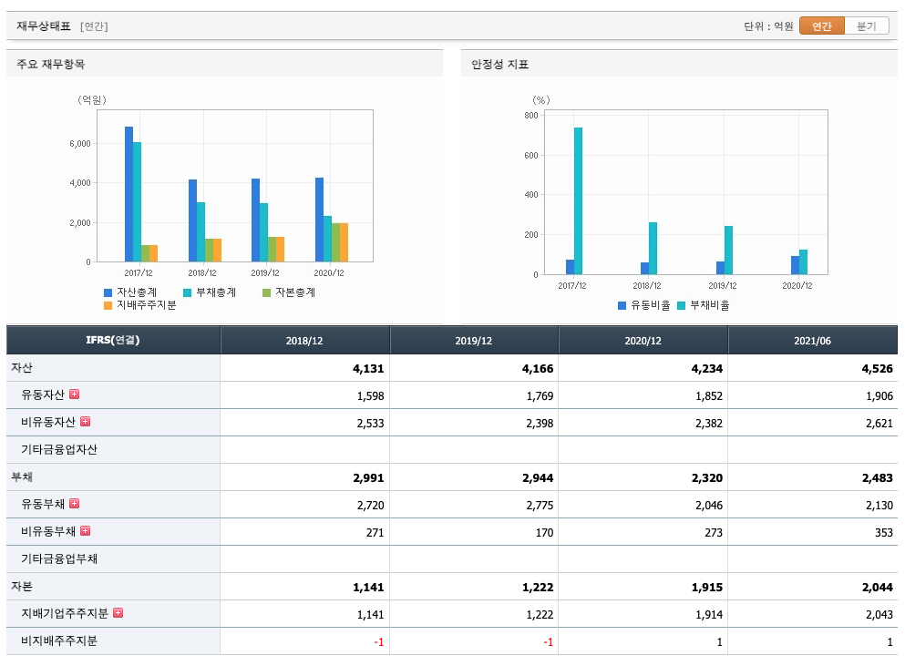 부채는 2018년 2991억원, 2019년 2944억원, 2020년 2320억원으로 감소, 2021년 1,2분기 2483억원으로 증가 하였습니다.