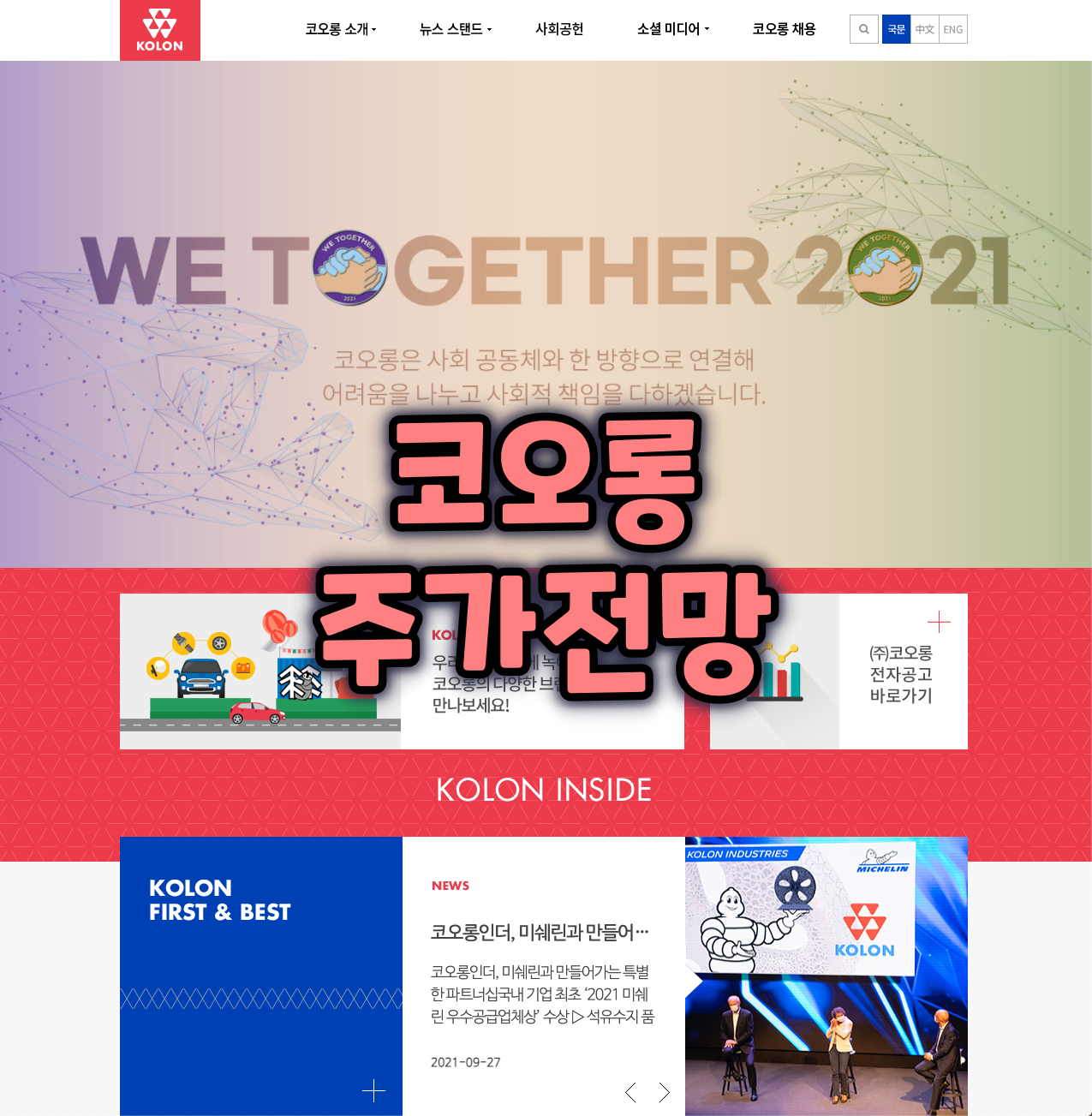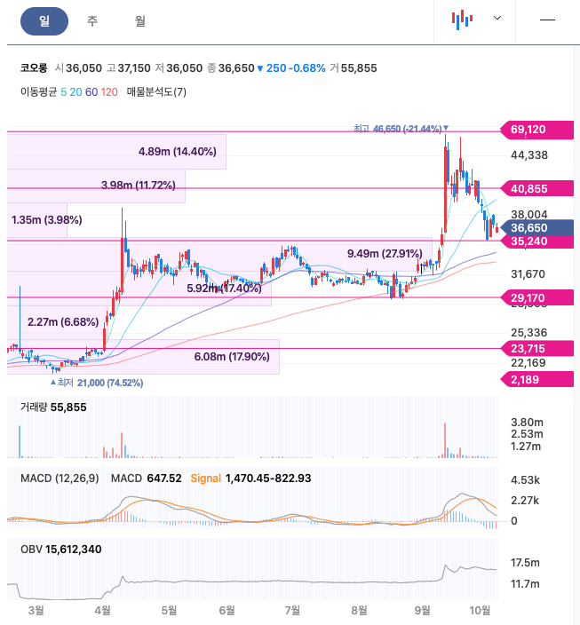 코오롱의 주가는 21년 4월에 급등하였고, 보합새를 이어가다가 21년 9월 최고 46,650원을 찍고 조정을 받고 있습니다.