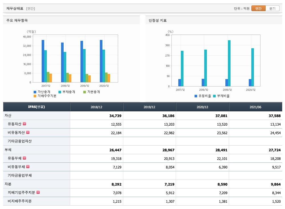 자산은 2018년 34,739억원, 2019년 36,186억원, 2020년 37,081억원, 2021년 1,2분기 37,588억원으로 증가 하였습니다.