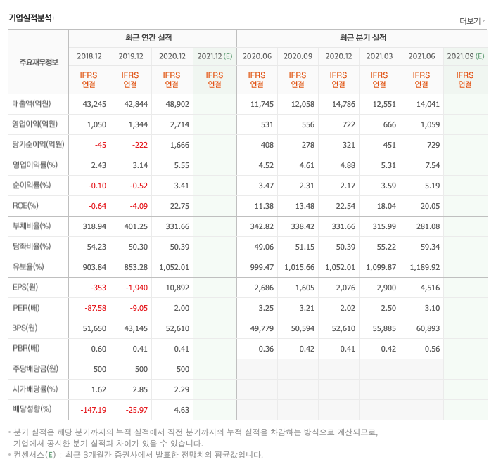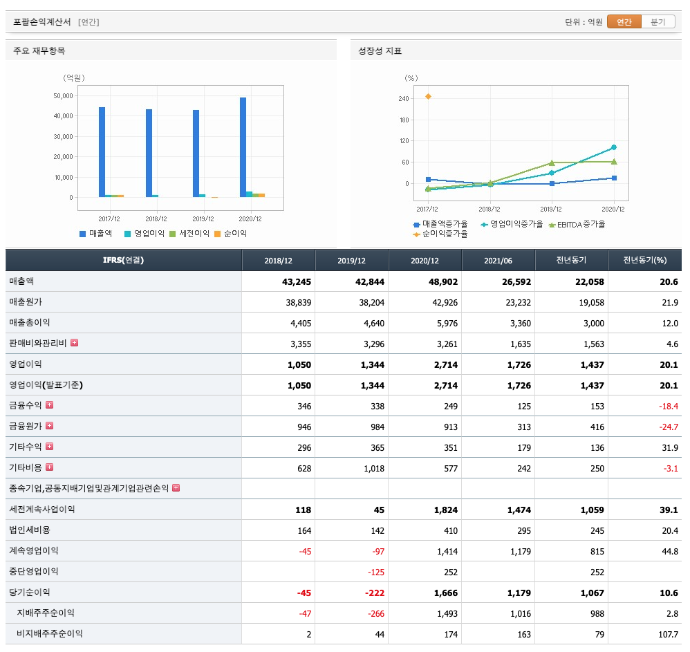 매출액 : 2018년 43,245억원, 2019년 42,844억원으로 감소, 2020년 48,902억원으로 증가, 2021년 1,2분기 26,592억원으로 전년동기대비 증가하였습니다. 2021년 2분기는 전년동기대비 20.6% 증가하였습니다. 2020년 분기별로 보면 3분기 12,058억원, 4분기 14,786억원, 2021년 1분기 12,551억원, 2분기 14,041억원입니다.
