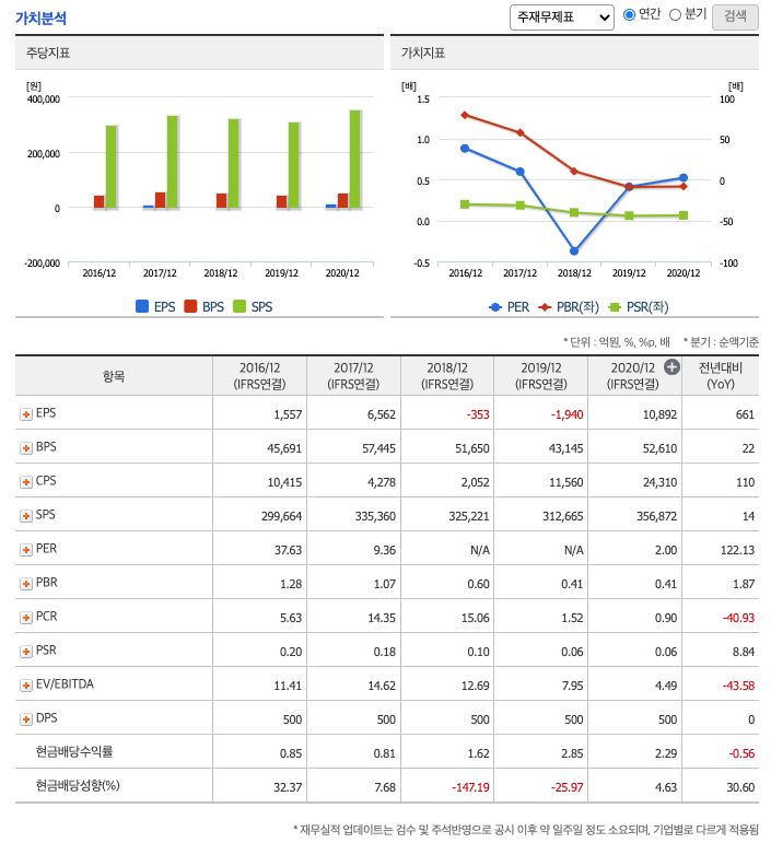 ROE(Return On Equity, 자기자본순이익율, 주주의 관점) : 2016년 약 3%, 2017년 약 12%, 2018년 약 -0.64%, 2019년 약 -4.09%, 2020년 약 22%이고, 자기자본순이익율은 이상율(10%)보다 높습니다.