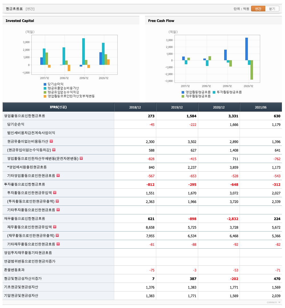 재무활동 현금흐름 : 2018년 612억원, 2019년 -898억원, 2020년 -2832억원, 2021년 1,2분기 224억원으로 2018년과 2021년 2분기의 재무활동 현금흐름은 플러스, 2019년과 2020년의 재무활동 현금흐름은 마이너스입니다.