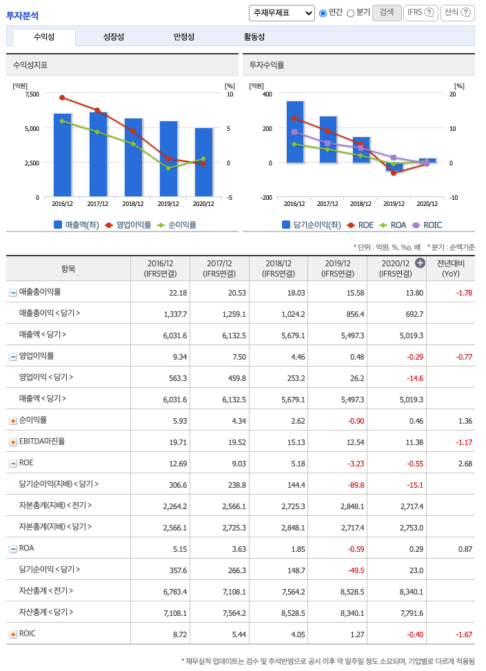 ROE(Return On Equity, 자기자본순이익율, 주주의 관점) : 2016년 약 12%, 2017년 약 9%, 2018년 약 5%, 2019년 약 -3%, 2020년 약 -0.55%이고, 자기자본순이익율은 이상율(10%)보다 낮습니다.