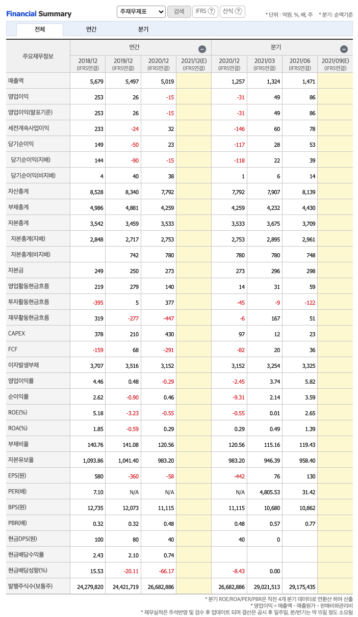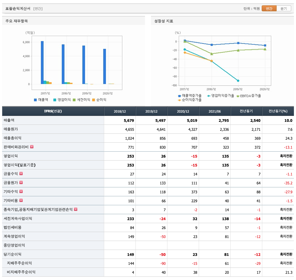 매출액 : 2018년 5679억원, 2019년 5497억원, 2020년 5019억원으로 감소, 2021년 1,2분기 2795억원으로 전년동기대비 증가하였습니다. 2021년 2분기는 전년동기대비 10% 증가하였습니다. 2020년 분기별로 보면 3분기 1223억원, 4분기 1257억원, 2021년 1분기 1324억원, 2분기 1471억원입니다.