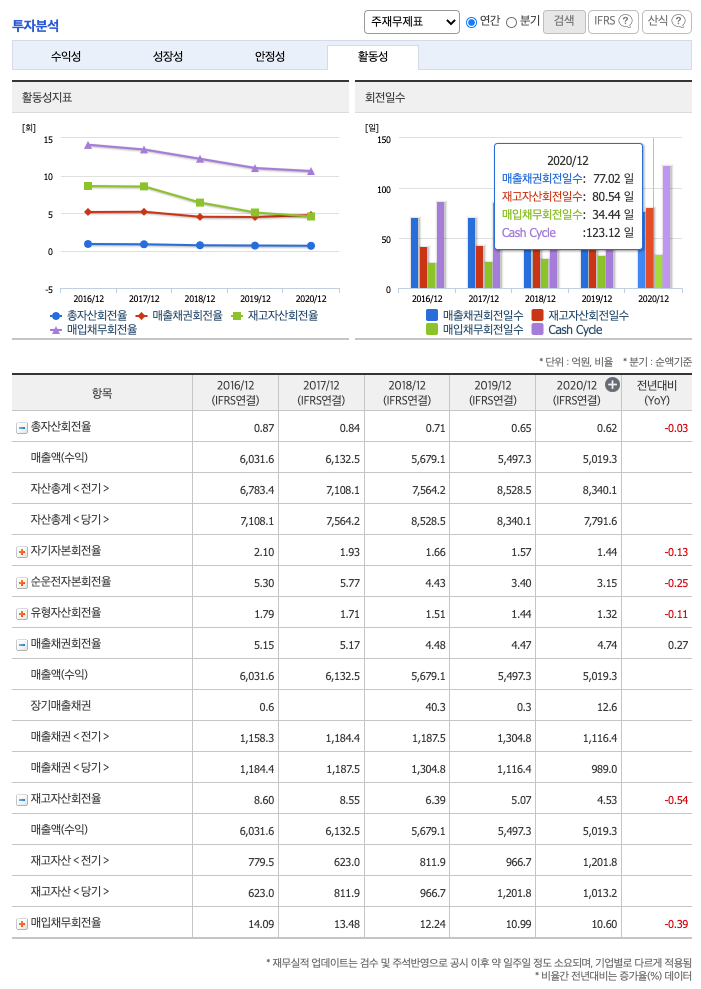 재고자산회전율(높을 수록 좋습니다) : 2018년 약 966억원, 2019년 약 1201억원, 2020년 약 1013억원이고, 회전율은 2018년 약 6%, 2019년 약 5%, 2020년 약 4%로 안정적입니다.