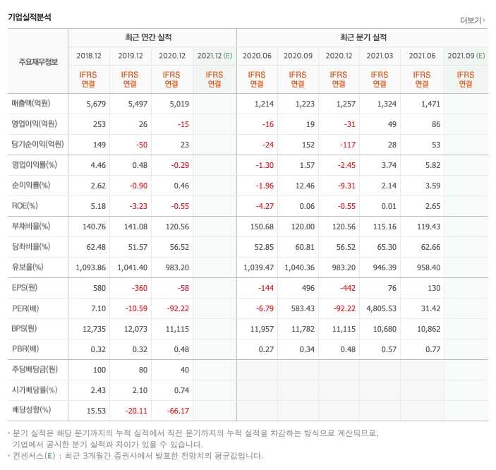 영업이익 : 2018년 253억원, 2019년 26억원, 2020년 -15억원으로 적자전환, 2021년 1,2분기 135억원으로 전년동기대비 흑자전환하였습니다. 2020년 분기별로 보면 3분기 19억원, 4분기 -31억원, 2021년 1분기 49억원, 2분기 86억원입니다.