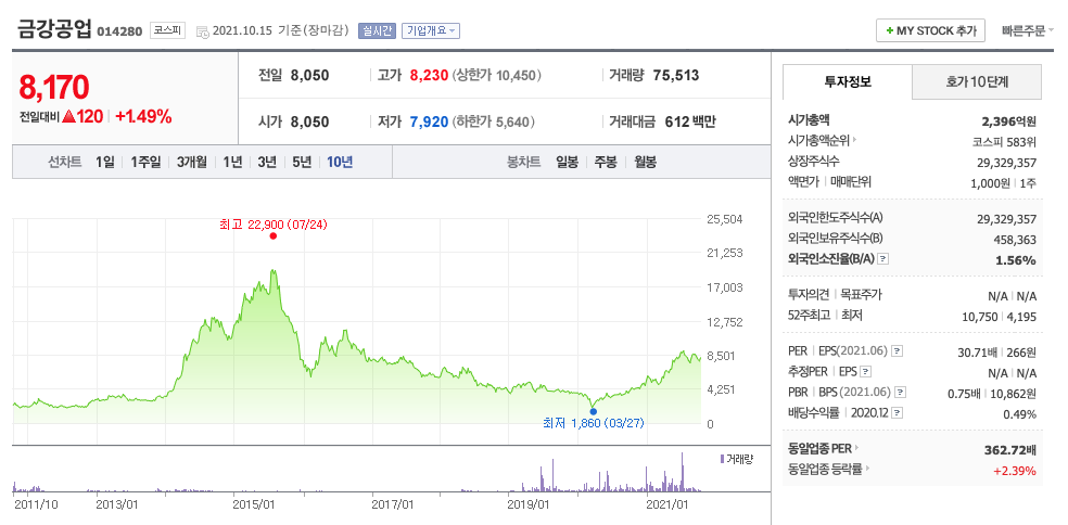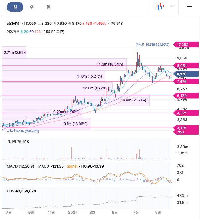 금강공업의 주가는 21년 3월부터 주가가 증가하기 시작하여 21년 7월 최고 10,750원을 찍고 조정을 받고 있습니다.