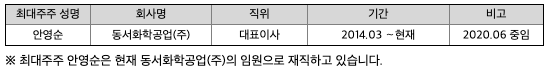 보고서 작성기준일 현재 당사의 최대주주는 안영순이며, 그 특수관계인의 지분율을 합하여 38.66%(보통주 기준)의 지분을 보유하고 있습니다. 최대주주인 안영순은 3,177,670주를 보유하여 지분율이 10.89%이고 그 특수관계자인 중원엔지니어링(주)외 5명이 8,100,804주를 보유하여 지분율 27.77%를 보유하고 있습니다.