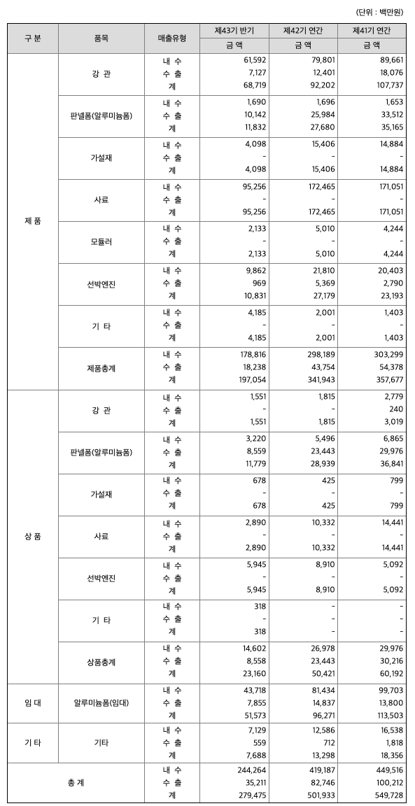 당사는 강관 및 건설용 가설자재를 전문생산하는 종합 메이커로서 주요 사업부문은 강관부문, 판넬사업부문, 가설재부문, 사료부문, 모듈러건축부문으로 구성되어 있으며, 각 사업부문별로 주요 제품을 생산하여 판매 및 임대하고 있습니다. 당반기 각 부문별 매출액 및 비중은 다음과 같습니다.