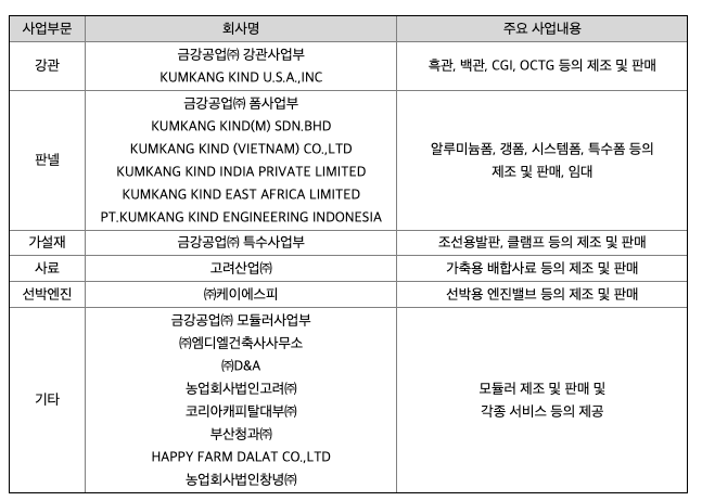 당사는 1979년 08월 금강철관(주)으로 설립되어 1980년 12월 상호를 금강공업(주)로 변경하였으며, 배관용, 구조용 강관 제조 및 판매, 폼웍시스템(알루미늄폼, 갱폼, 시스템폼, 특수폼) 제조 및 임대업 등을 주요사업으로 영위하고 있는 강관 및 건설용 가설자재 종합 메이커 업체입니다. 당사 및 종속회사의 사업부문별 현황을 요약하면 아래와 같습니다.