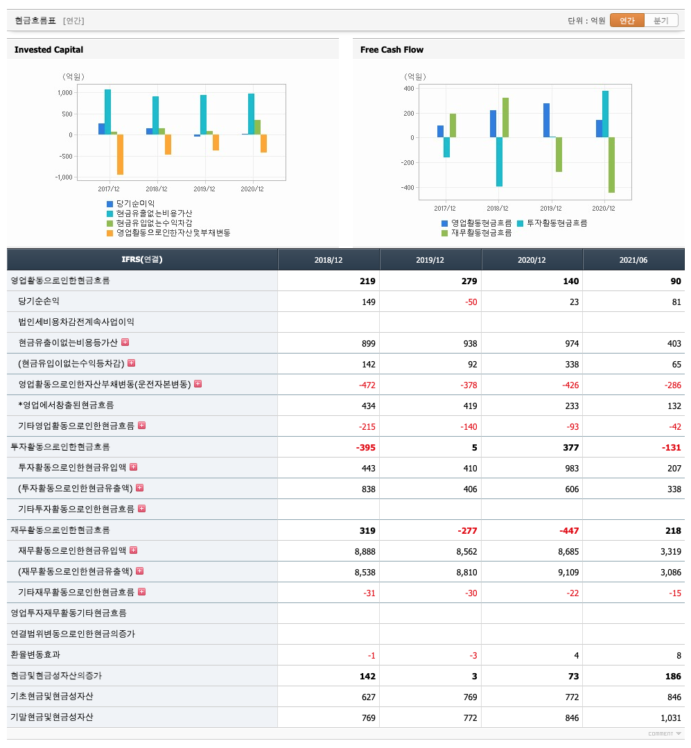 투자활동 현금흐름 : 2018년 -395억원, 2019년 5억원, 2020년 377억원, 2021년 1,2분기 -131억원으로 2018년과 2021년 2분기의 투자활동 현금흐름은 원활합니다.
