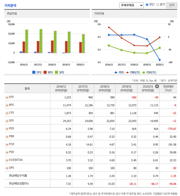 DPS(Dividend Per Share의 약자, 총배당금을 총주식발생수로 나눈 것, 한 주당 얼만큼의 배당금을 받을 수 있는지 알 수 있는 지표, DPS가 높을 수록 배당금이 많은 것임) : 2016년 100원, 2017년 100원, 2018년 100원, 2019년 80원, 2020년 40원으로 감소하였습니다.