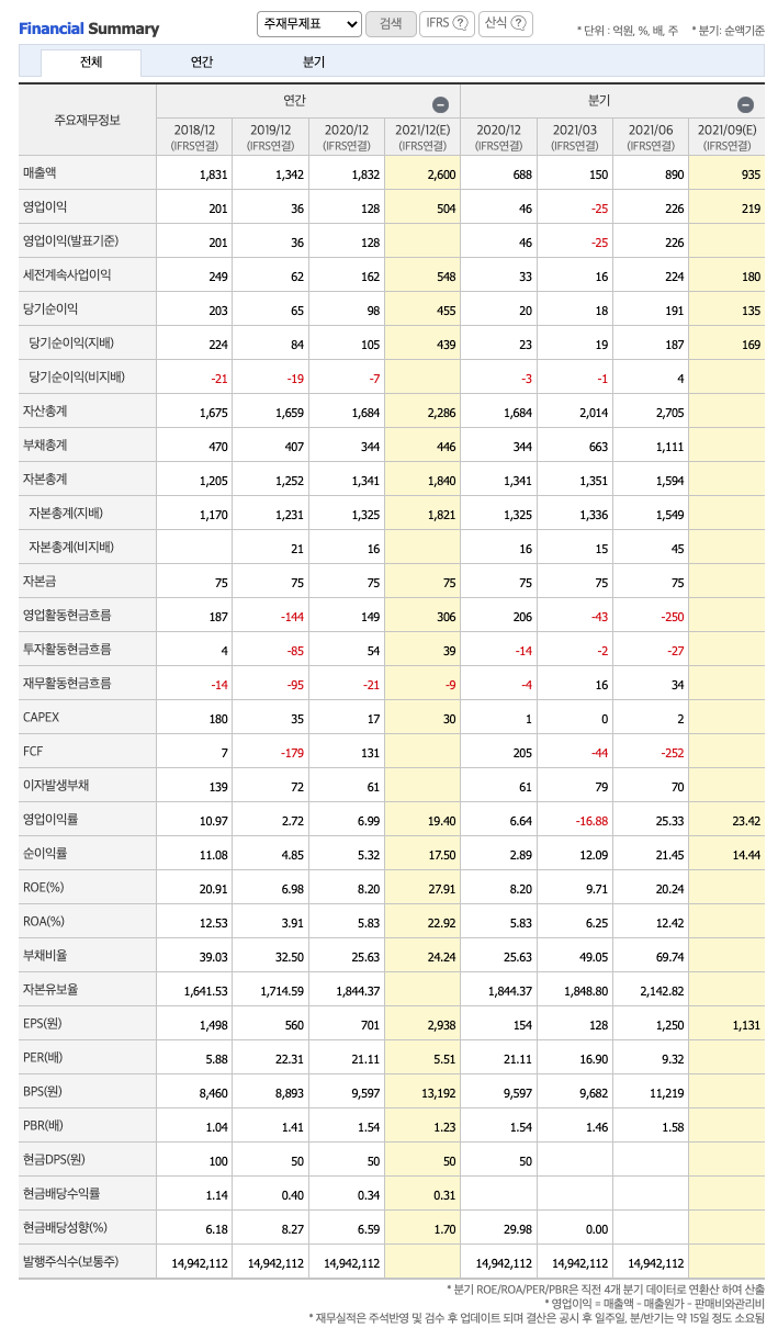 영업이익 : 2018년 201억원, 2019년 36억원, 2020년 128억원, 2021년 1,2분기 200억원으로 전년동기대비 증가하였습니다. 2021년 2분기는 전년동기대비 1729.8% 증가하였습니다. 2020년 분기별로 보면 3분기 71억원, 4분기 46억원, 2021년 1분기 -25억원, 2분기 226억원입니다.