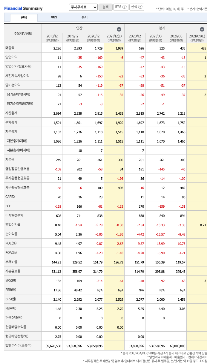 영업이익 : 2018년 11억원, 2019년 -35억원, 2020년 -169억원, 2021년 1,2분기 -58억원으로 전년동기대비 적자지속하였습니다. 2020년 분기별로 보면 3분기 -43억원, 4분기 -56억원, 2021년 1분기 -43억원, 2분기 -15억원입니다.