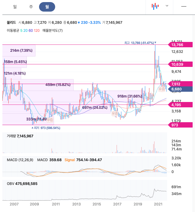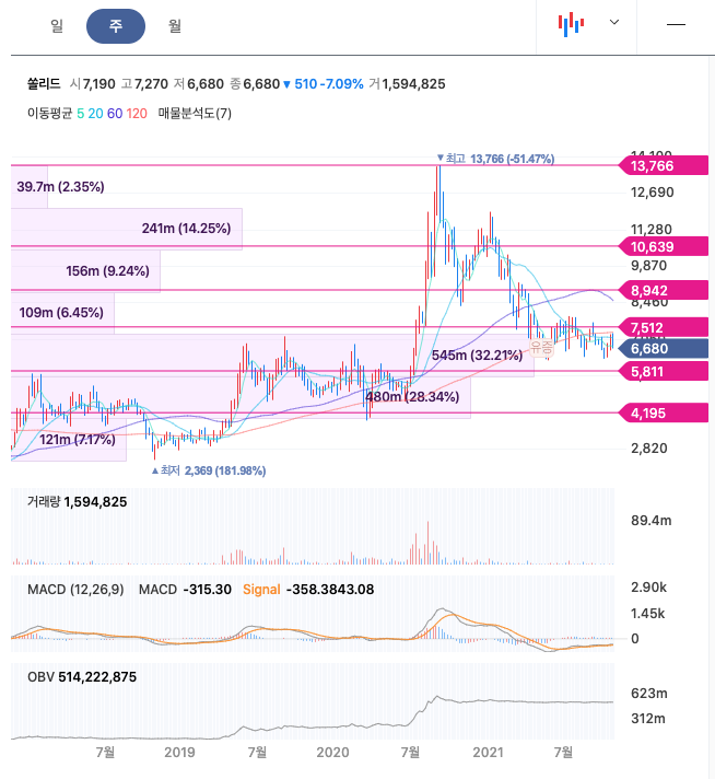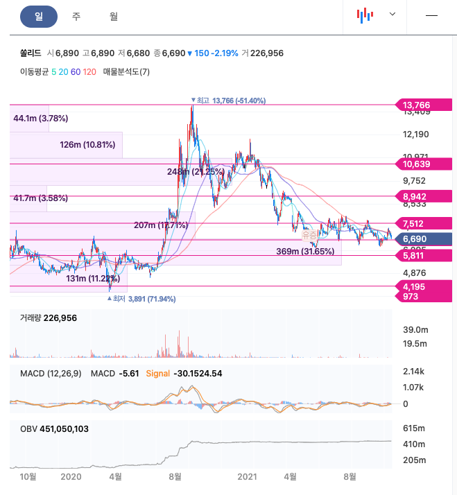 쏠리드의 주가는 20년 9월에 최고 13,766원을 찍고 조정을 당하고 있습니다.