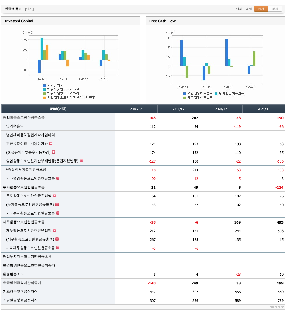영업활동 현금흐름 : 2018년 -108억원, 2019년 202억원, 2020년 -58억원, 2021년 1,2분기 -190억원으로 2019년을 제외하고 영업활동 현금흐름이 원활하지 못합니다.