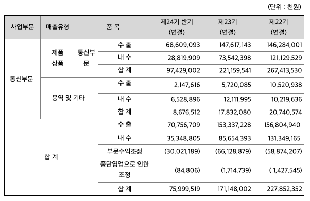 당사 및 종속회사는 이동통신 관련 사업을 영위하고 있으며, 부문 매출액 및 총 매출에서 차지하는 비율은 다음과 같습니다.